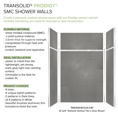 Prodigy PWKX60367224-240 60" x 36" x 96-in Glue to Wall 6-Piece Shower Wall Trimmable Kit 12" x 24" Vertical Tile, in Dark Grey